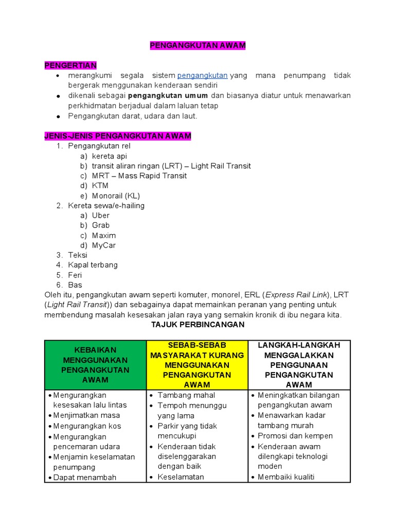 Hal ini bertambah runcing lagi apabila tiba waktu. Oleh itu sebagai pengguna jalan raya yang bijak kita perlulah menyahut seruan kerajaan agar menggunakan pengangkutan awam sebagai kaedah untuk bergerak dari satu destinasi ke satu destinasi yang lain. FAEDAH MENGGUNAKAN PENGANGKUTAN AWAM Pendahuluan.
